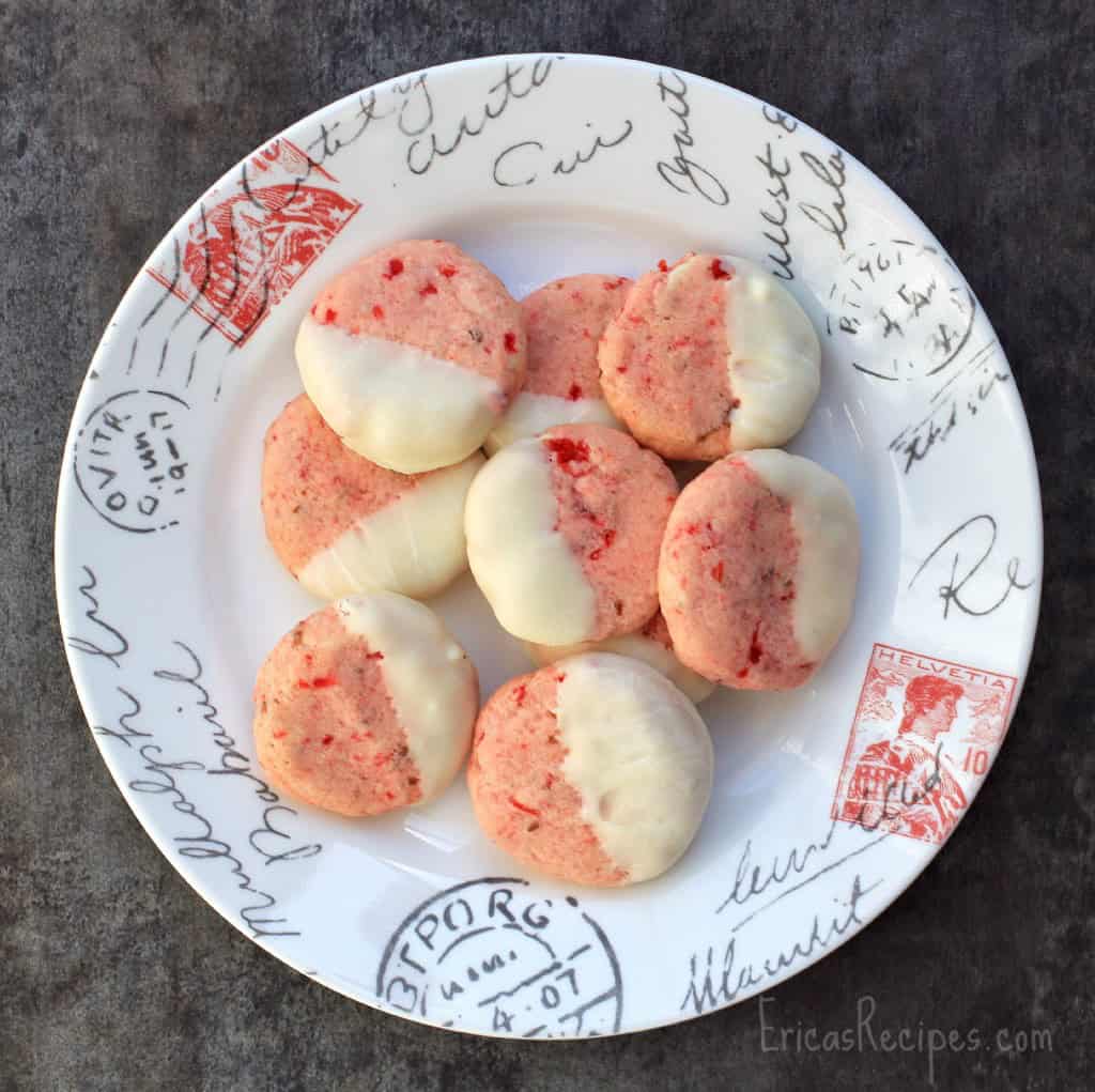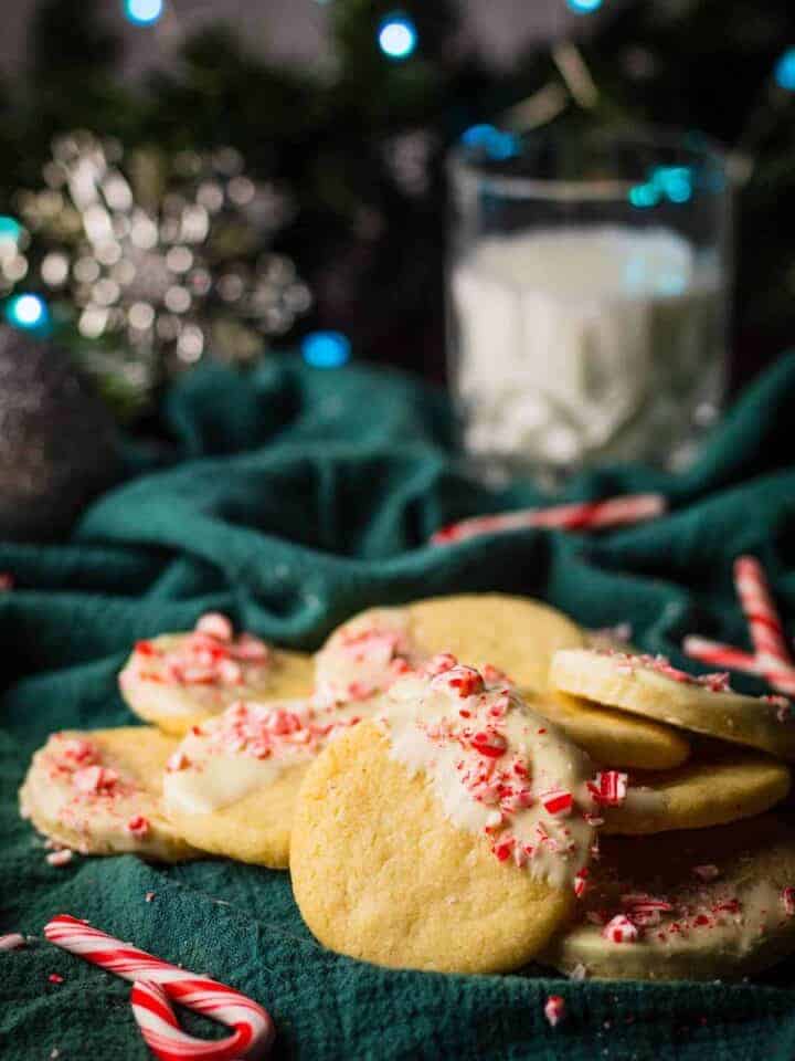 White chocolate peppermint cookies are the perfect Christmas cookie for holiday baking. These easy to make buttery shortbread cookies are dipped in rich white chocolate and topped with crushed peppermint candies.
