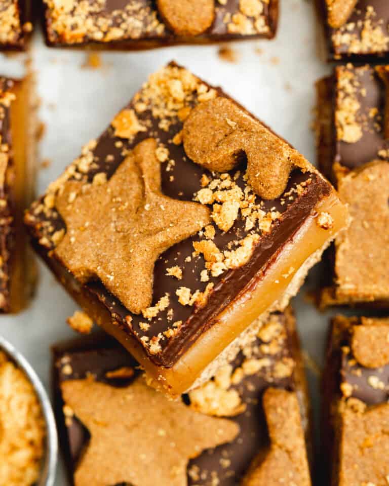 Delicious vegan caramel slice with gingerbread as the base. Topped with chocolate and homemade vegan gingerbread cookies, a festive twist on classic millionaires shortbread.