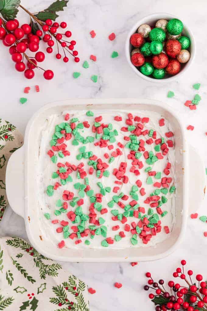 The sweet and salty combination is often topped with festive sprinkles or crushed candy canes for a festive touch. It’s a popular and easy-to-make Christmas dessert that’s sure to be a hit with everyone.