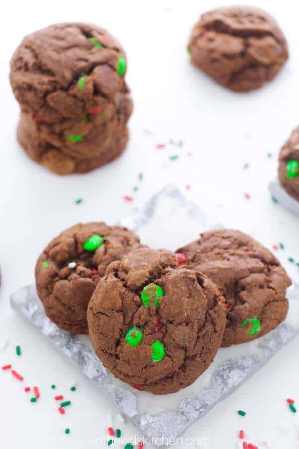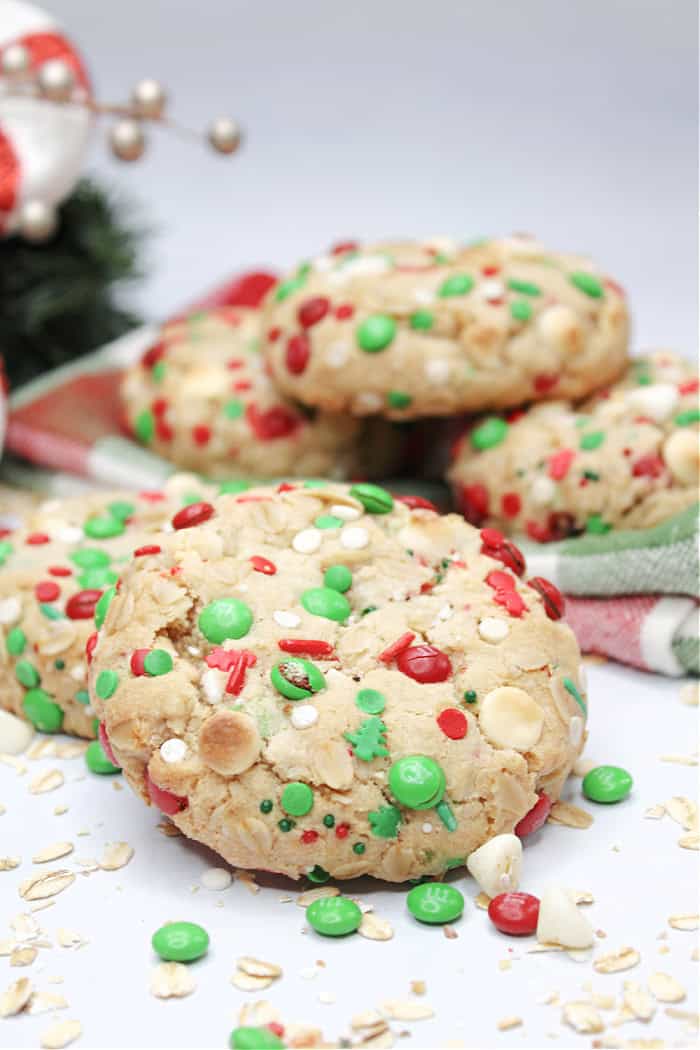 They’re full of white chocolate chips and holiday M&Ms, so they have a wonderful holiday look, and the oatmeal gives them a fantastic texture. You can’t beat them!