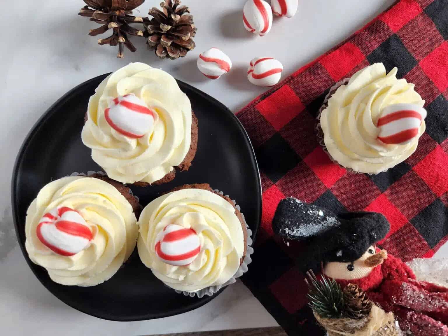 Chocolate cupcakes topped with creamy peppermint buttercream frosting are the perfect holiday dessert.