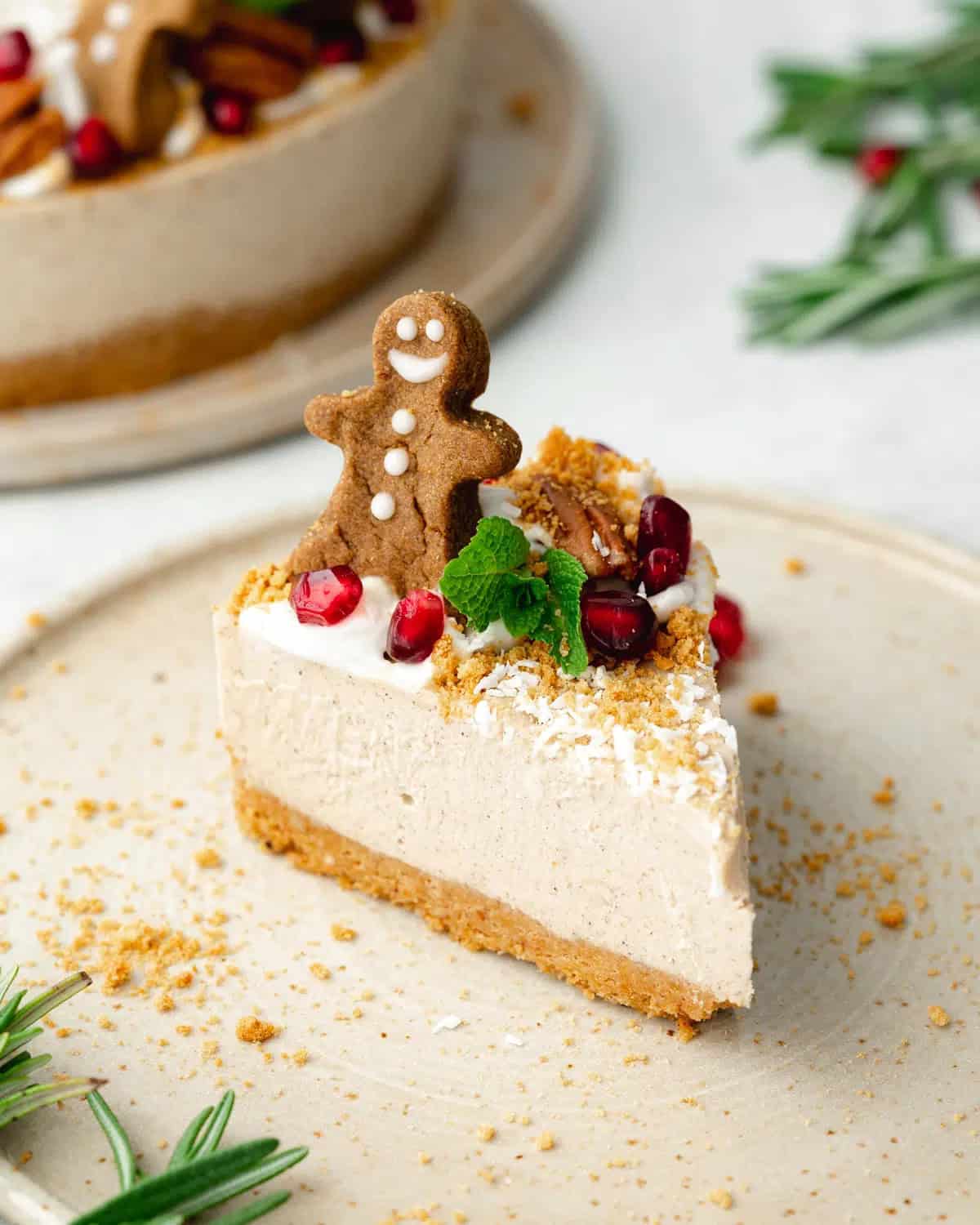 This delicious vegan gingerbread cheesecake is the perfect festive dessert for your holiday table. A creamy gingerbread filling on top of a no-bake ginger cookie crust.