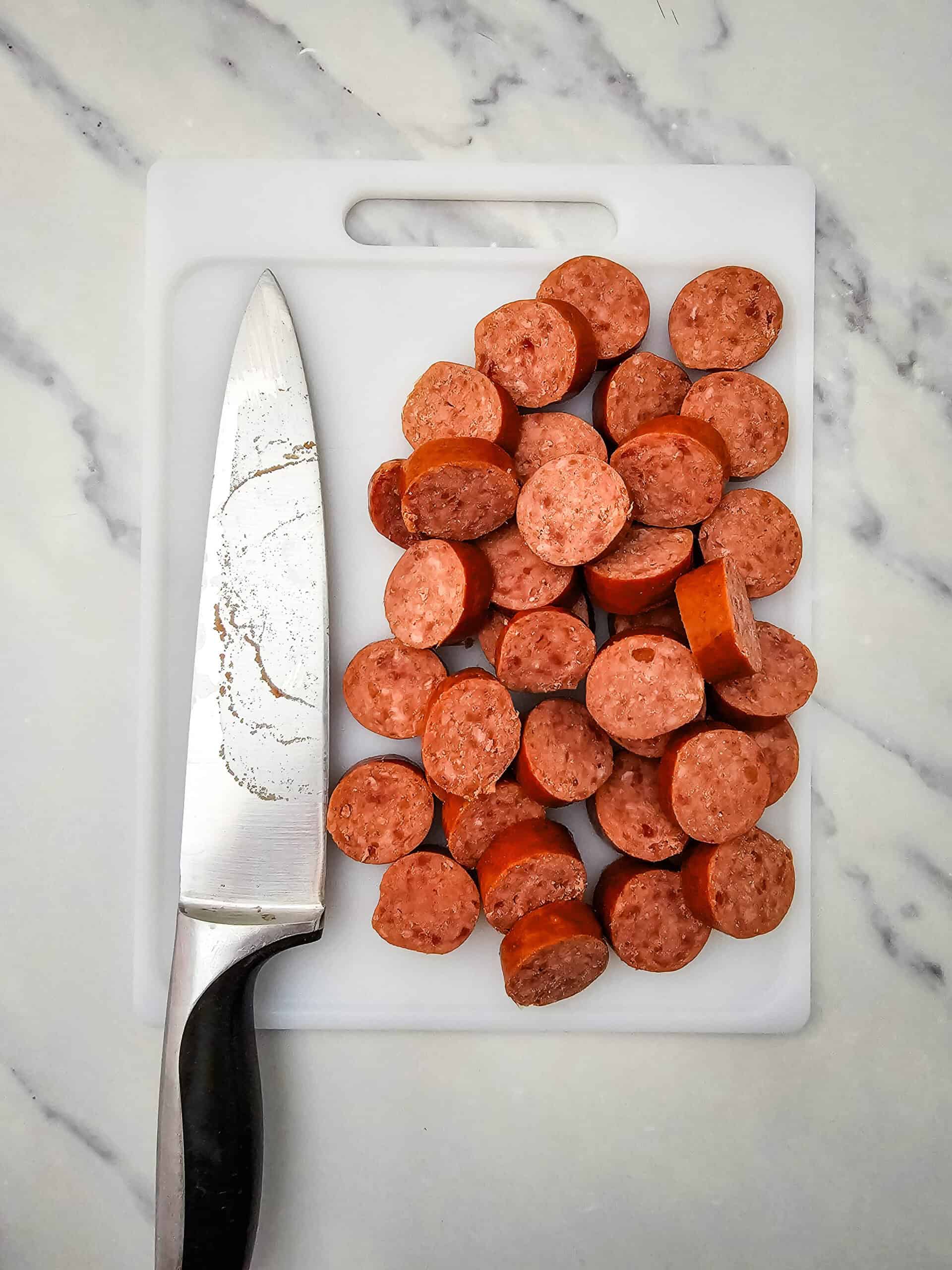 - Cut the smoked sausage into 1 inch pieces.