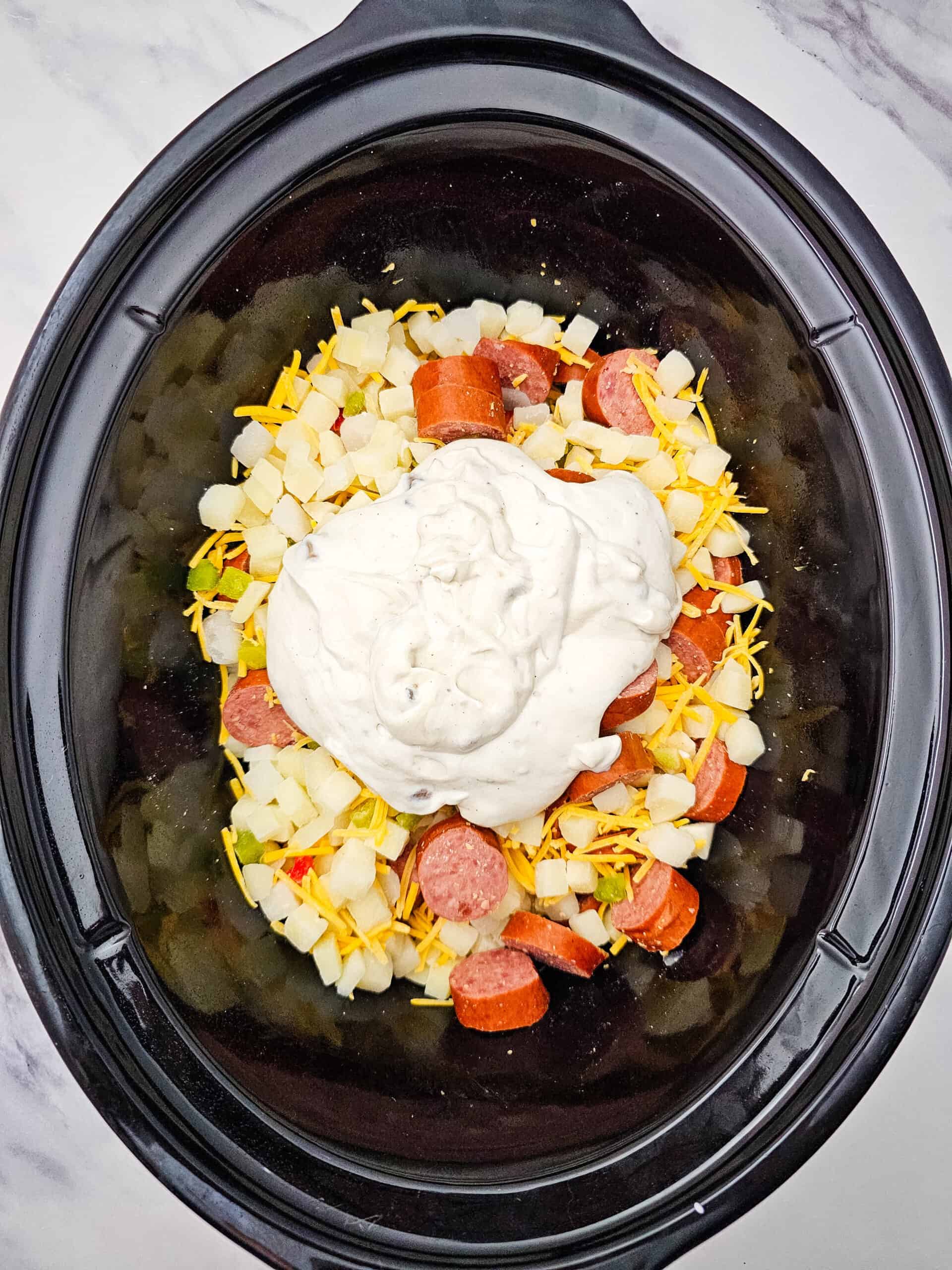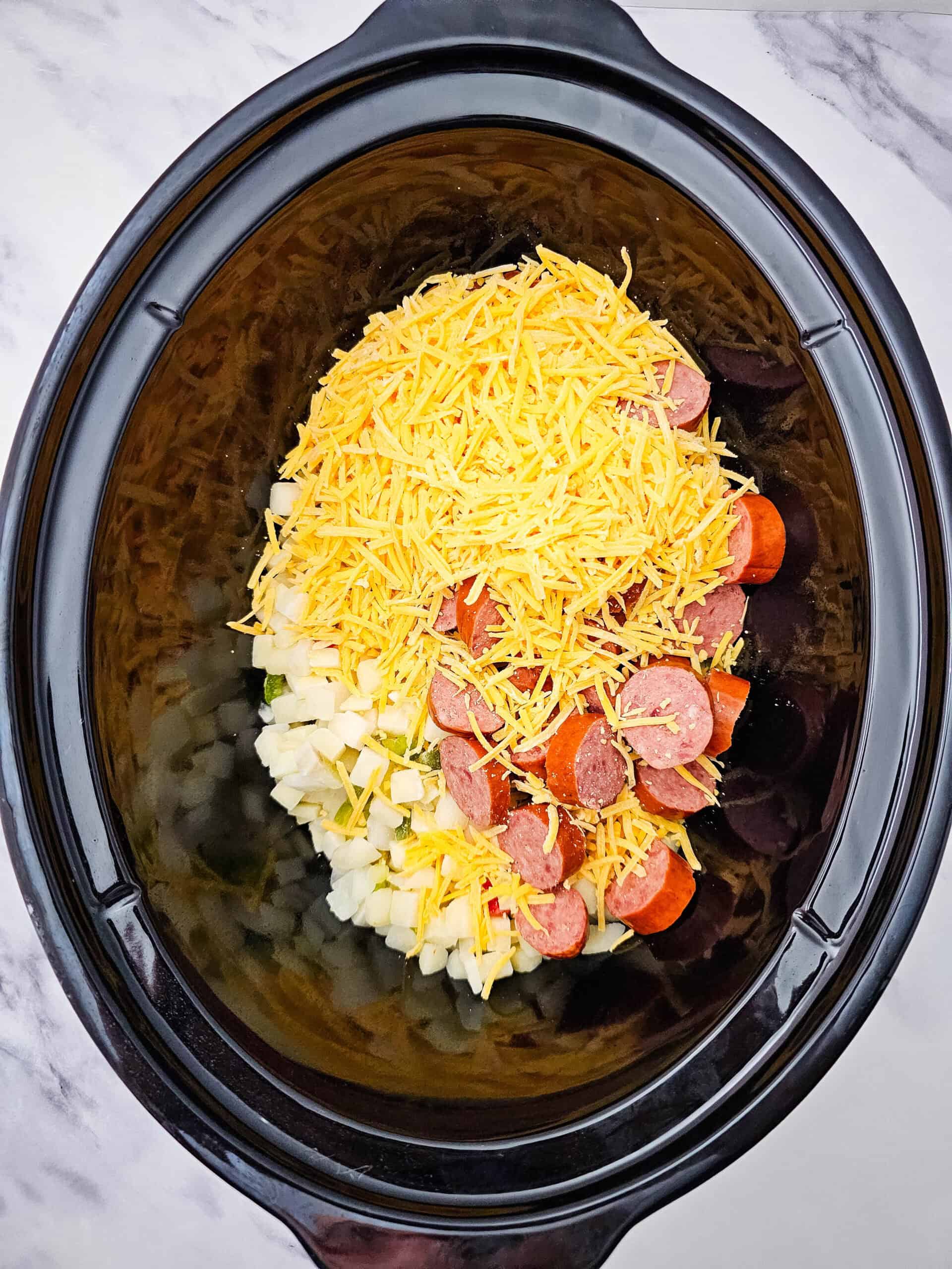 - Add the potatoes, smoked sausage and 1 ½ cups of the cheese to the crockpot and gently toss together.