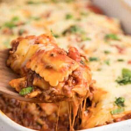 This extremely easy Baked Ravioli Casserole recipe is like a lasagna but with half the work. It takes an easy meat sauce made with a jarred tomato sauce to a new level with store-bought ravioli. It is a hearty, nourishing dish that the whole family will love on any weeknight.