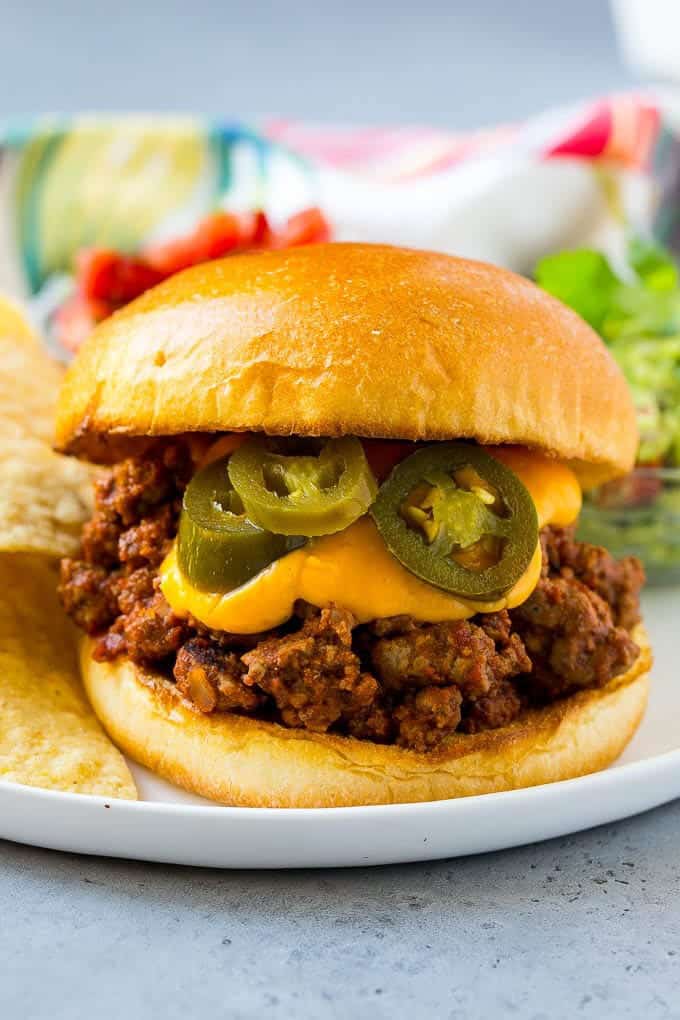These nacho sloppy joes include Mexican style ground beef, nacho cheese sauce and jalapenos, all between toasted buns. An easy and unique dinner that the whole family is sure to enjoy.