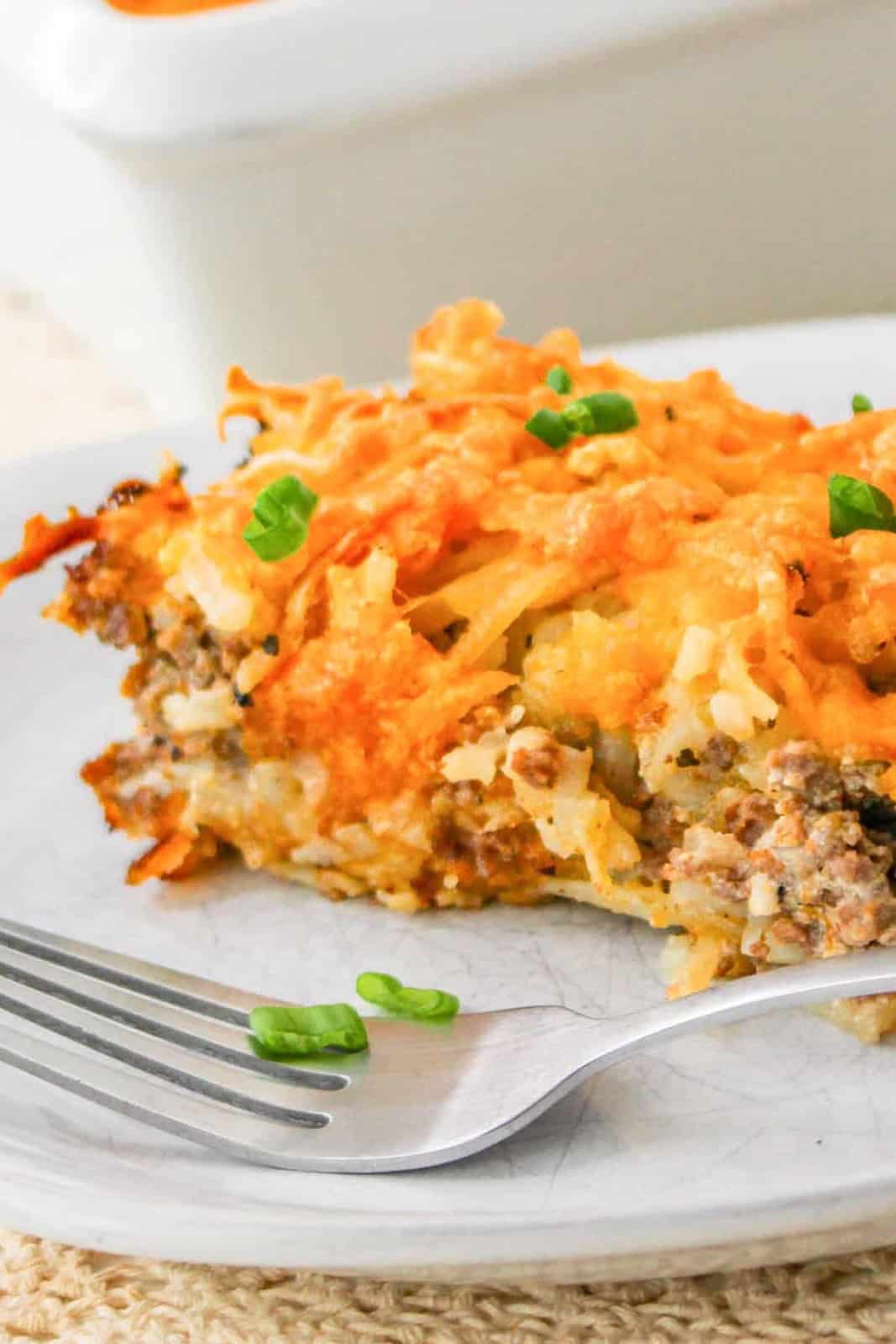 This ground beef hashbrown casserole has a savory layer of ground beef mixed with onions and cheese and topped with a crispy, golden layer of hashbrowns. It’s so good and great for breakfast or dinner.