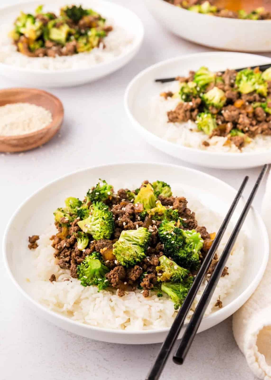 Juicy ground beef is cooked in a savory-sweet sauce with soy sauce, garlic, ginger, and a hint of brown sugar, creating a rich and satisfying meal.