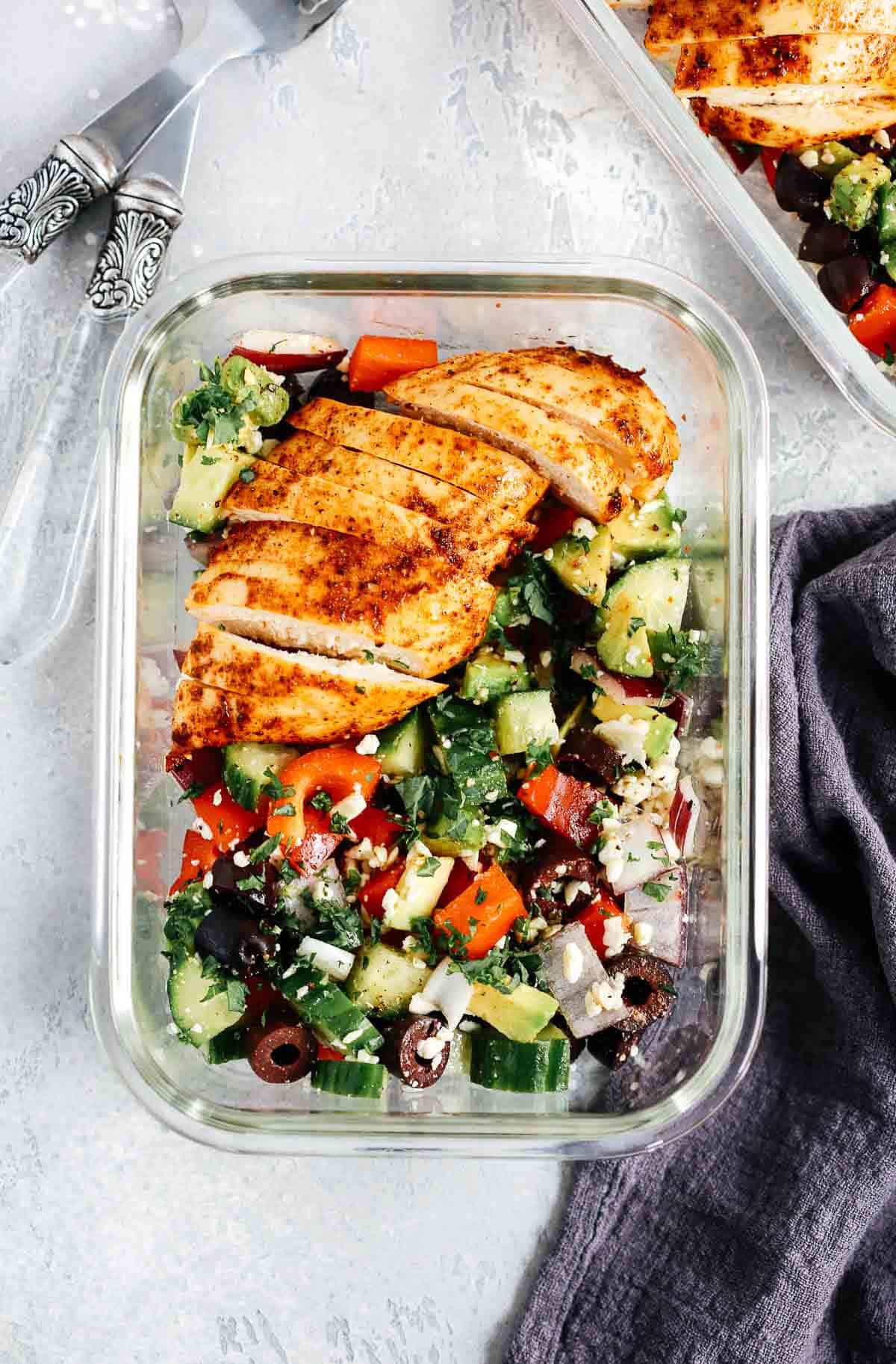 A Greek Chicken Salad has incredible spring flavors you can enjoy any time of year. Packed with bright, fresh ingredients, it makes a great lunch or meal prep solution.