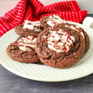 These tasty cookies start with a cake mix base, and are finished off with a marshmallow center, then drizzled in chocolate and sprinkled with candy cane bits. Perfect for your holiday cookie exchanges, these cookies will be a favorite!
