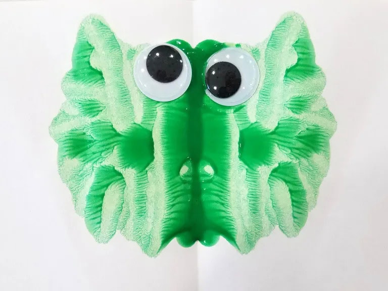 Ready for a cute but really simple monster craft? Simply fold a sheet of paper in half. Have the kids add a little paint, then smush the paper together. When they open it, they will never make the same monster twice. Let the paint dry before adding the googly eyes.