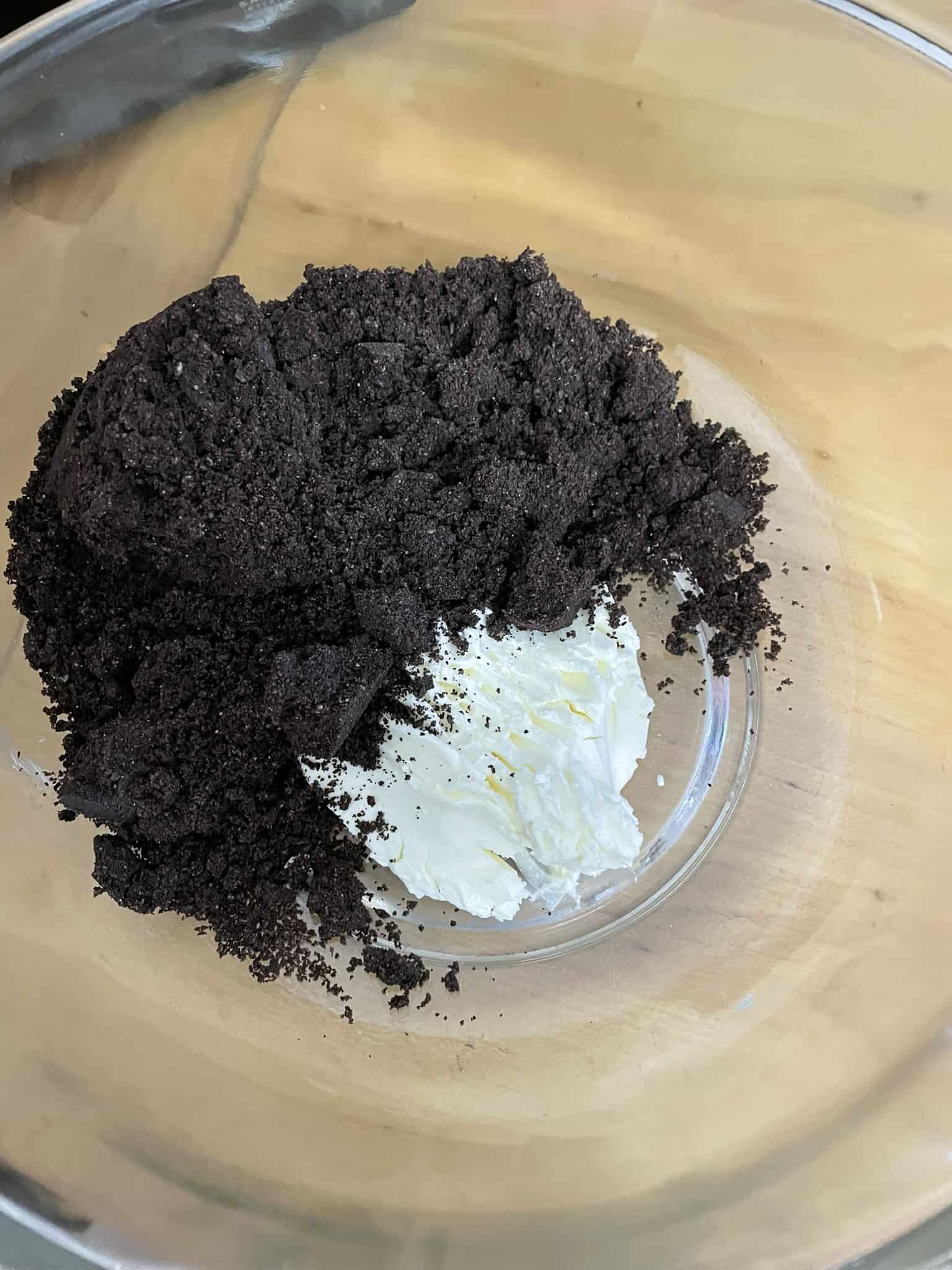 2. Mix the Truffle Dough- In a large bowl, combine Oreo crumbs, softened cream cheese, espresso powder, and peppermint extract. (hands work great for this!)