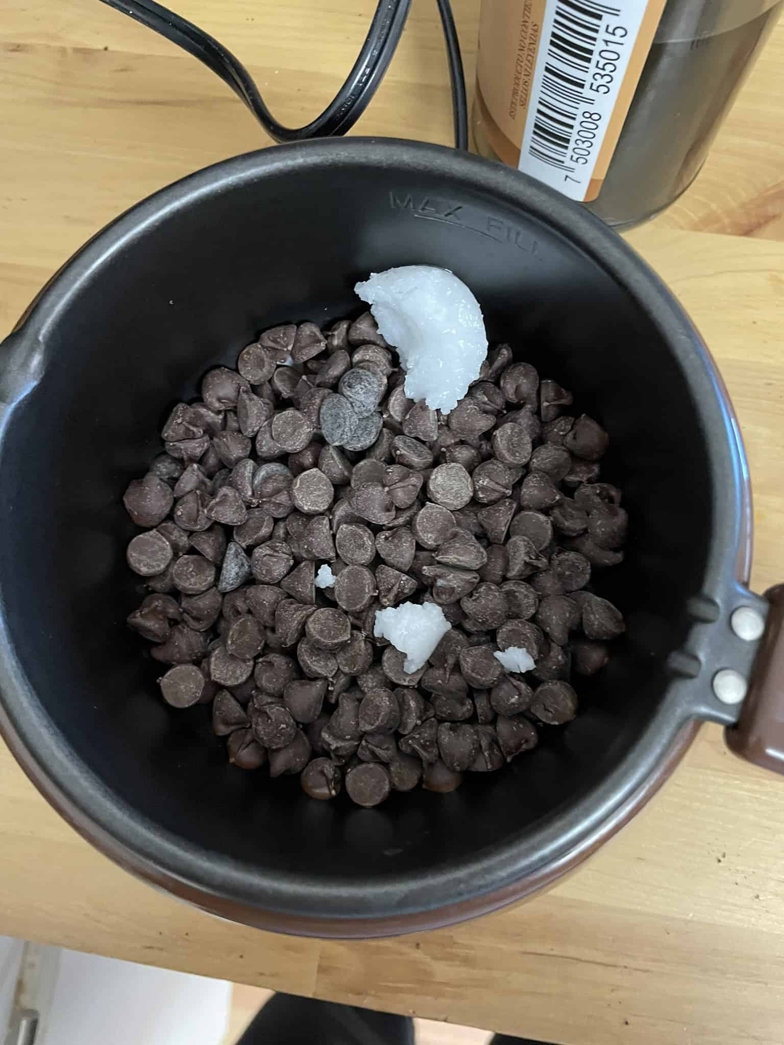 In a microwave-safe bowl, melt chocolate chips and coconut oil in 20-second bursts, stirring between each, until smooth and glossy. Or use a double boiler on the stove.