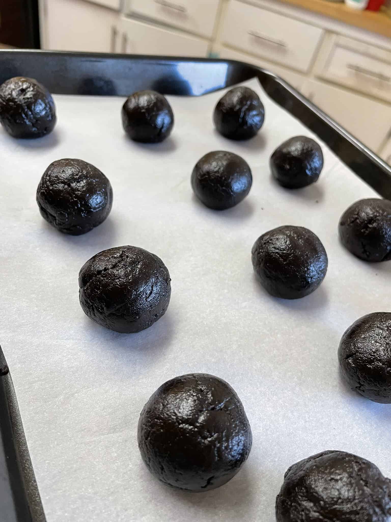 Roll the dough into 1-inch balls and place on a parchment-lined baking sheet. Using a tablespoon helps to shape them into perfect circles if you don’t have a mold handy.
