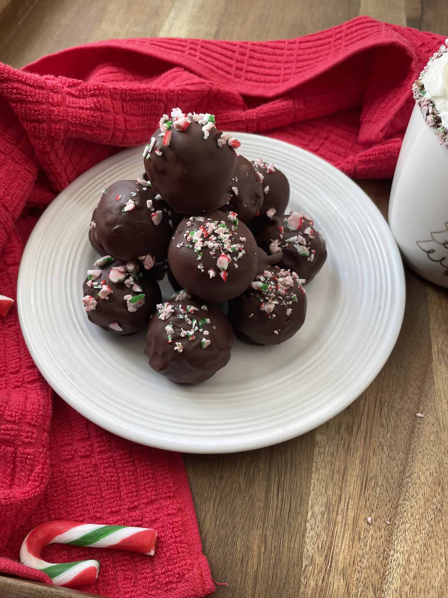 5. Dip & Decorate- Using a fork, dip each chilled truffle into the melted chocolate, letting the excess drip off. Place them on parchment paper and sprinkle with crushed candy canes before the coating sets.