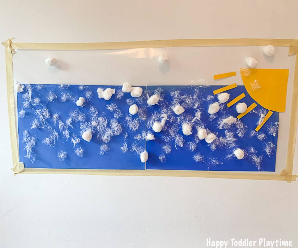 If you’ve never created a sticky wall before you are missing out because they are so much fun for little ones. Basically, you take a piece of contact paper (sticky side up) to your wall. Then provide them with cutouts that they can stick on. You can make any scene you would like, but the tutorial for this one is a cloudy day that uses cotton balls and strips of paper.