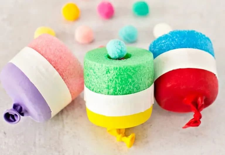 This craft is actually considered a stem activity, but I knew younger kids would love these. All you do is cut a pool noodle and duct tape a balloon onto the ends. Then you can put in the poms poms and pull back the balloon so it shoots out. Talk about staying busy on a rainy day. You can also keep these and let them play later.