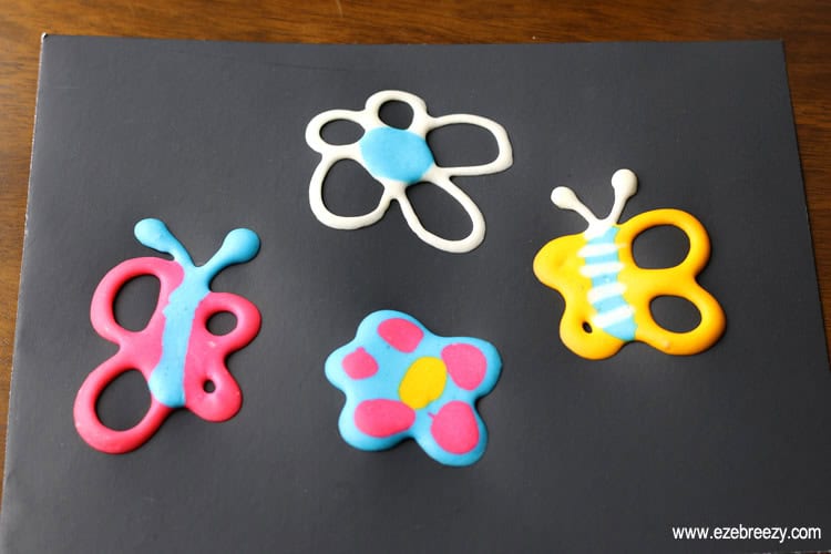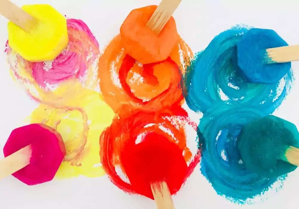 If you want to paint with ice, you will have to prepare ahead of time. Add water to an ice cube tray with a few drops of food coloring. Then place a popsicle stick and freeze overnight. When you’re ready to craft, pop the cubes from the tray and toddlers are ready to paint!