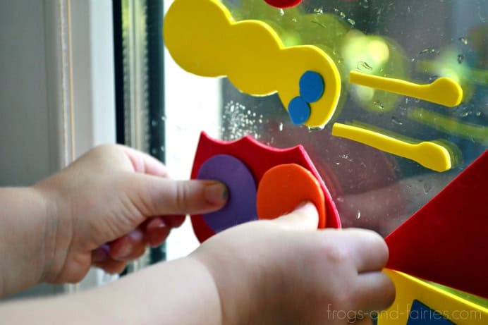 Talk about hours of fun! While the raindrops fall you can keep younger children busy with a window puzzle. Make any scene you would like. Simply cut different shapes out of craft foam, then let them create the picture on the window. The foam clings by adding a little water. Think of how foam letters stick in the bathtub, same concept.