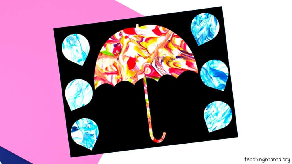 The swirled colors on the umbrella are beautiful and the secret ingredient is shaving cream! Some toddlers may not even finish the craft because they are so entertained by the different colors in the shaving cream. Once the paper is dipped it does take about 30 minutes to dry, then you can glue on the umbrella. The tutorial also shows you how to make marbled raindrops.