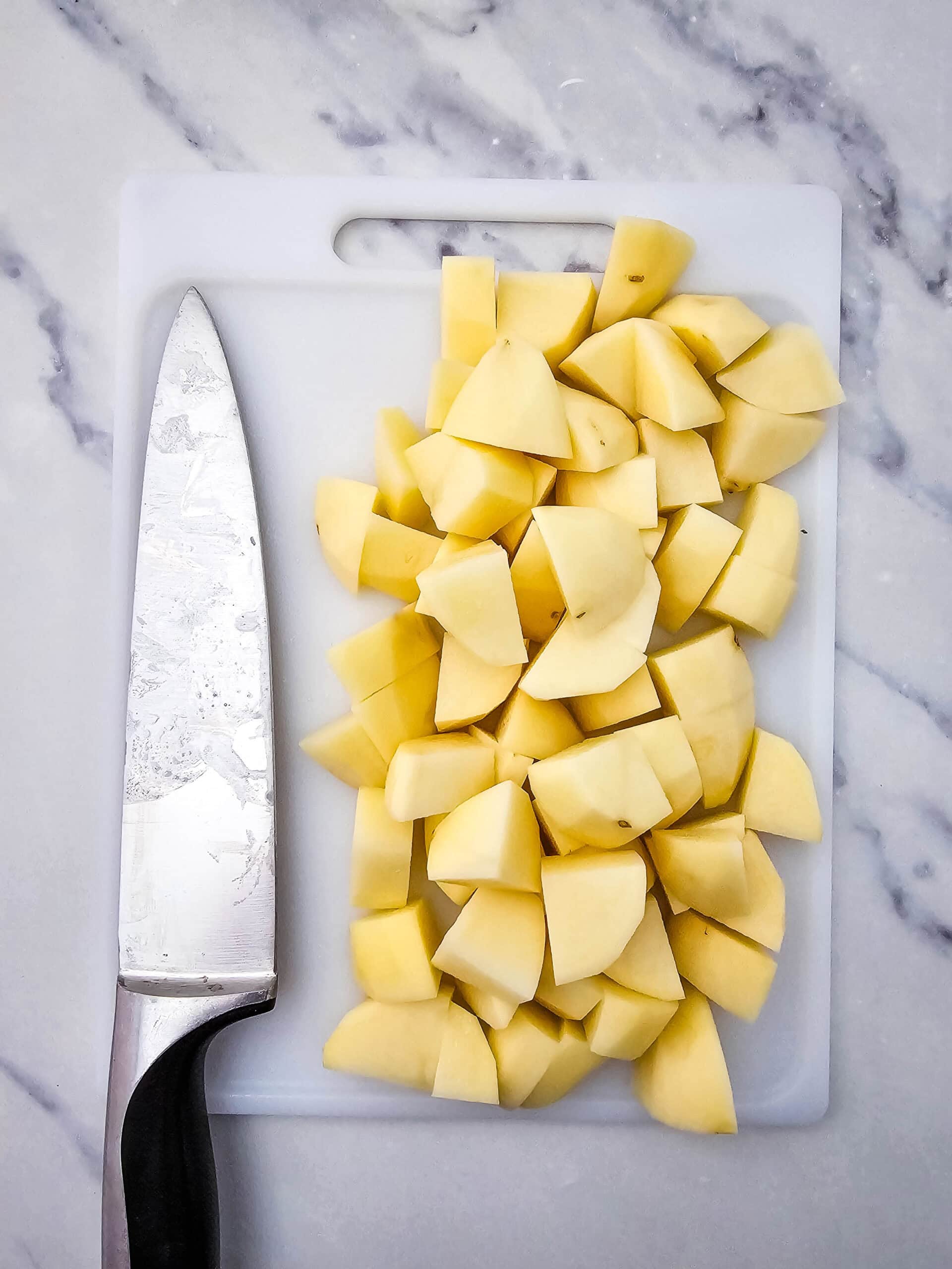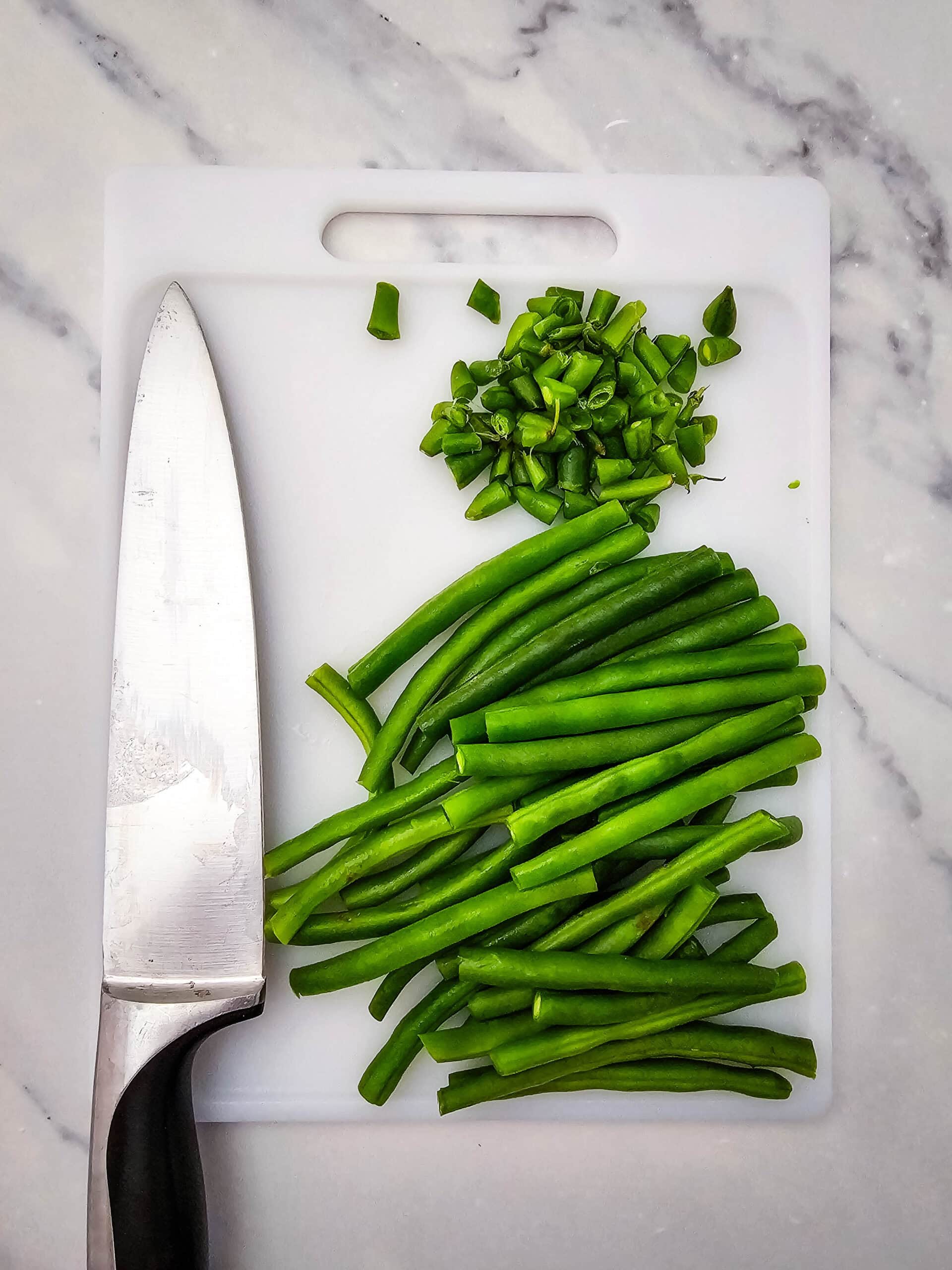- Dice the potatoes into small cubes. Trim the ends off the green beans.