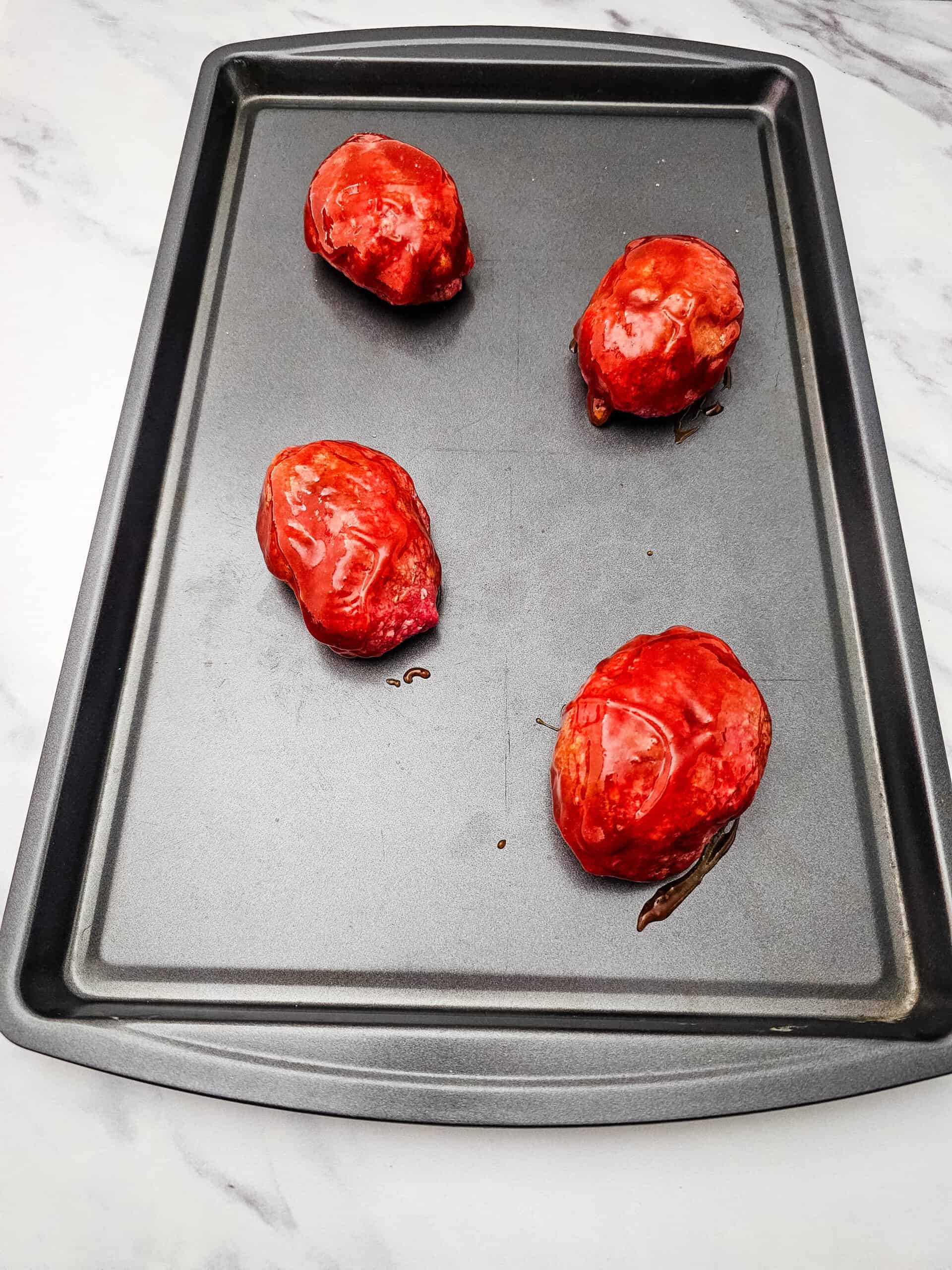 - Mix the ketchup and brown sugar together in a small bowl and brush over the mini meatloaves.