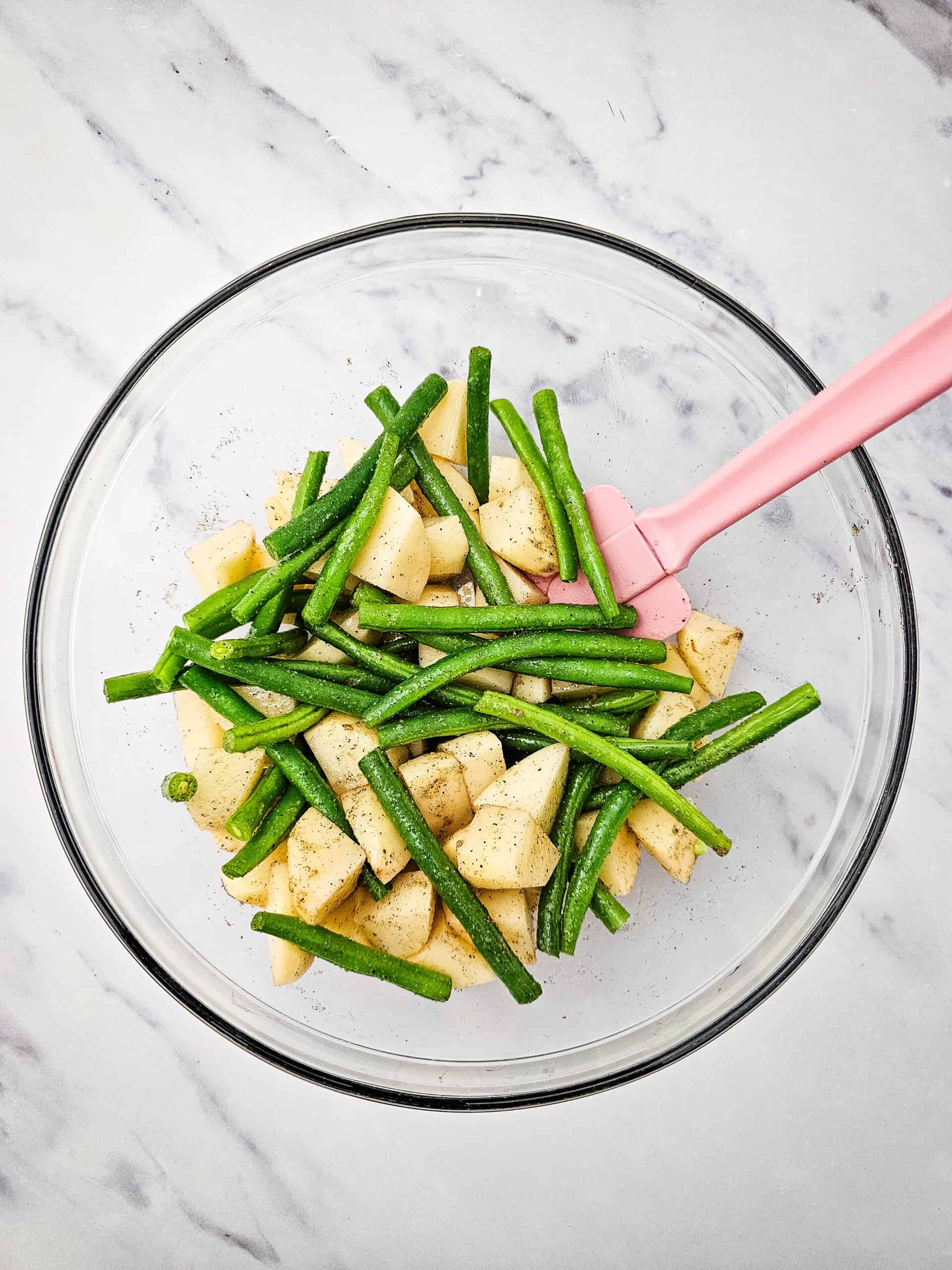 - To a large bowl, combine the potatoes, green beans, olive oil and the rest of the seasonings. Pour onto the sheet pan.