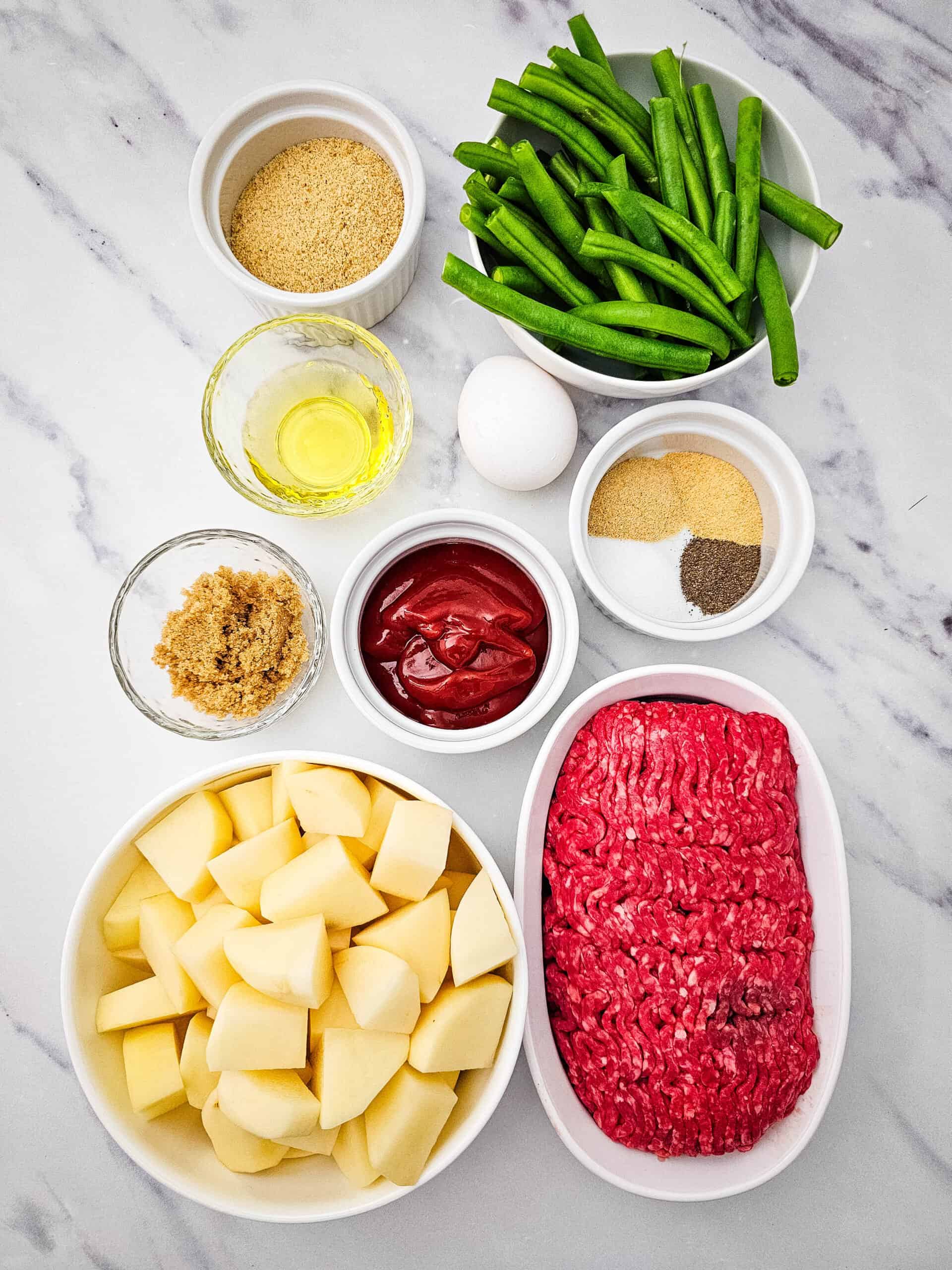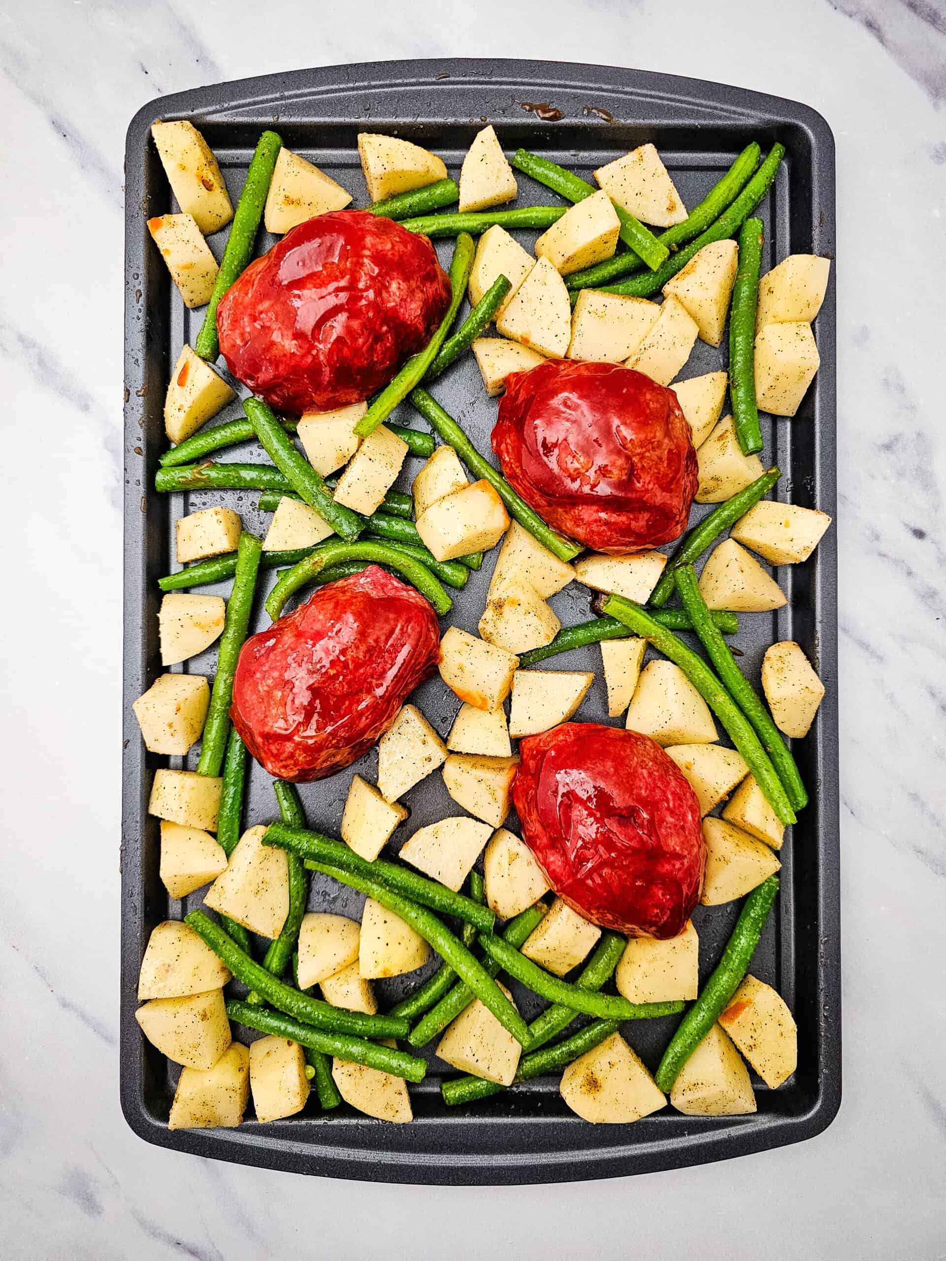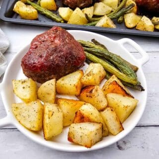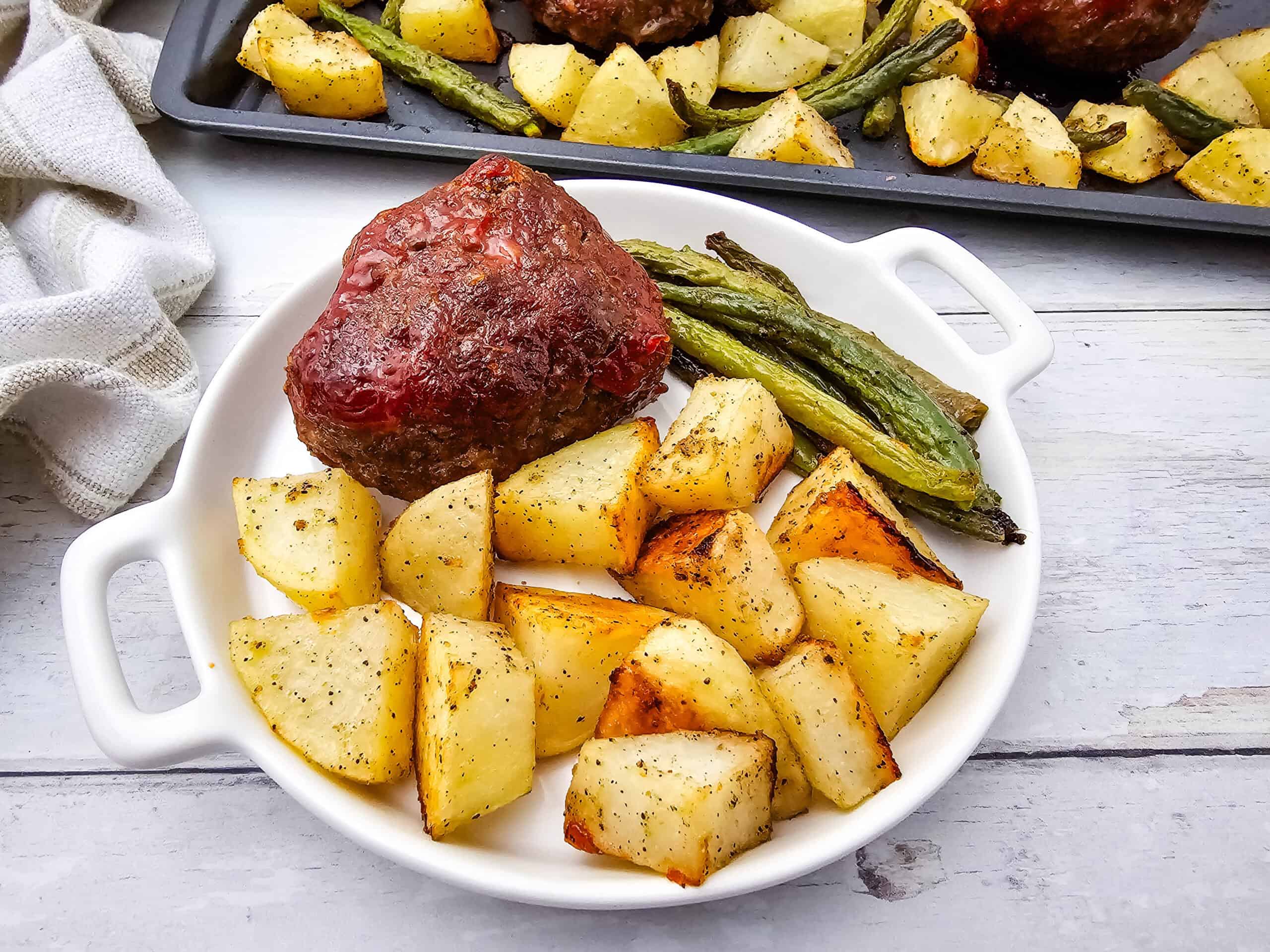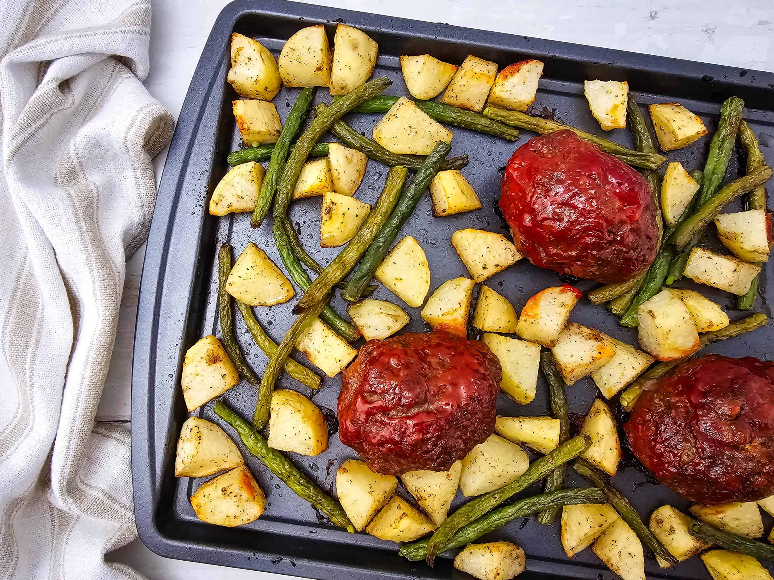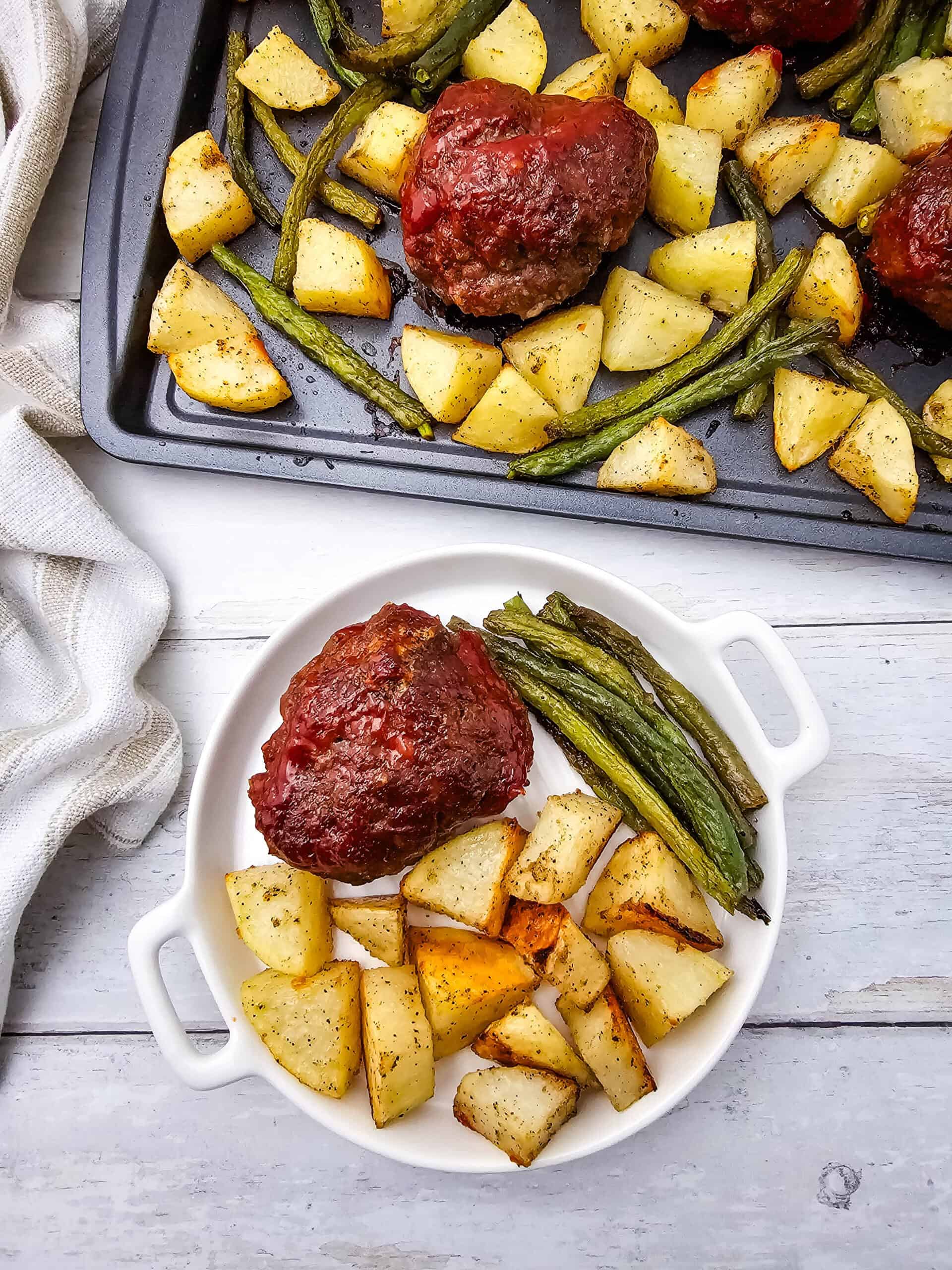 Roasted potatoes and green beans tossed in olive oil cook right alongside the mini meatloaves, making cleanup minimal and flavor maximum. It’s a hearty, comforting dinner all on one pan — perfect for busy nights! 🍽️✨